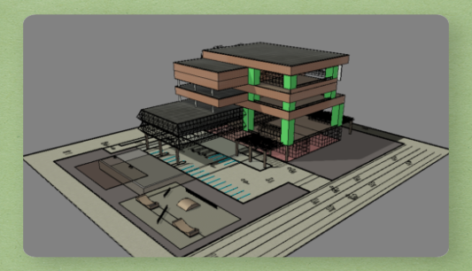 While I was making my masses, my building went through a lot of different phases. I put in 3 parks on various levels and water harvesting infiltration and storage facilities around the lot. I built an underground garage, but only one very large level. The street has some parking and I did put a parking lot in by the office building for ADA and short term parking. The back part of the lot holds a small park and a skate park. One of the buildings just to the south of the property sells skate equipment. Seems like a good place for extra advertising for both of our businesses. An extra element I thought would be a nice addition is a bridge over the entrance driveway. With a span of ten feet, there could be general seating or benches to experience the summer evening on.